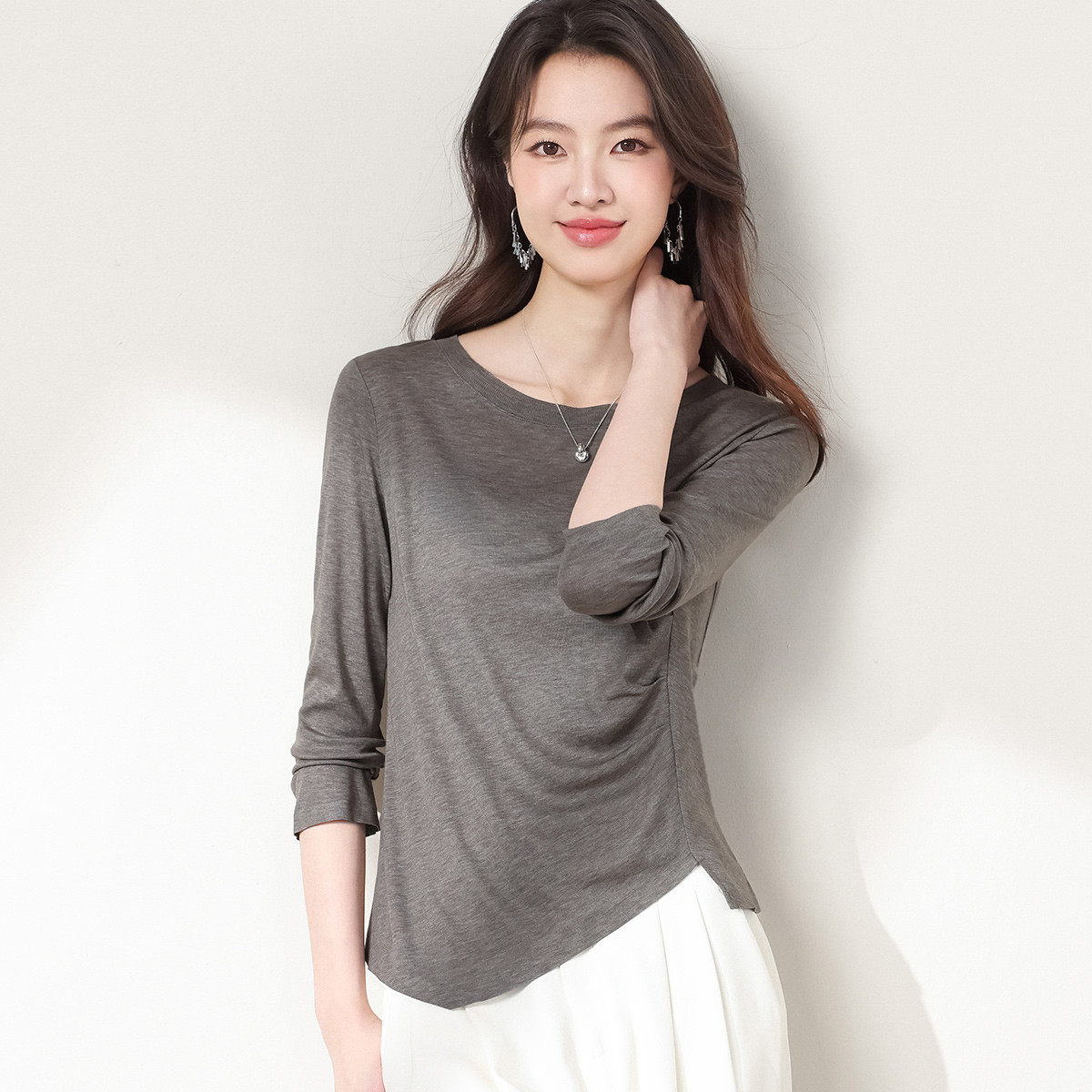 【含桑蚕丝】圆领纯色休闲针织打底衫长袖百搭针织套衫薄女式T恤 833427