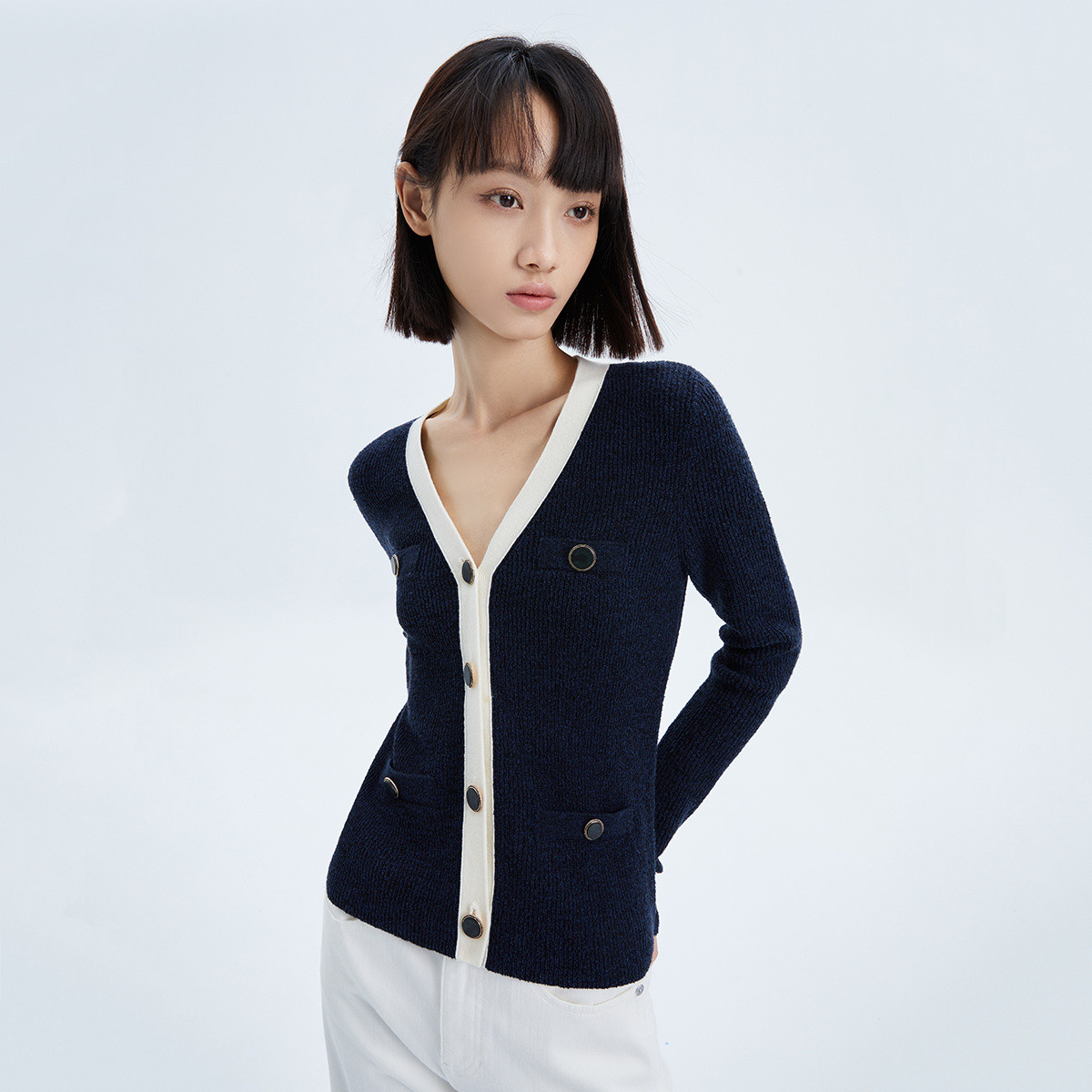 【含天丝桑蚕丝】春夏专柜修身v领拼色针织开衫气质百搭时尚 618897