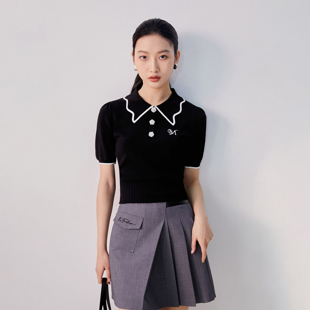 【甜美通勤】翻领拼色泡泡袖刺绣短袖针织衫女 165329