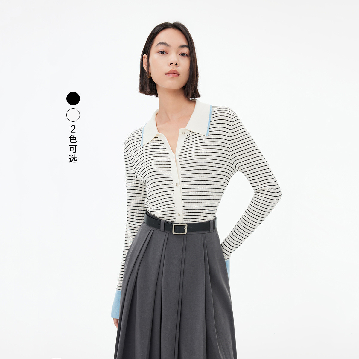 春秋款纯绵羊毛条纹小翻领拼色设计感修身套头针织衫朗姿集团 001497