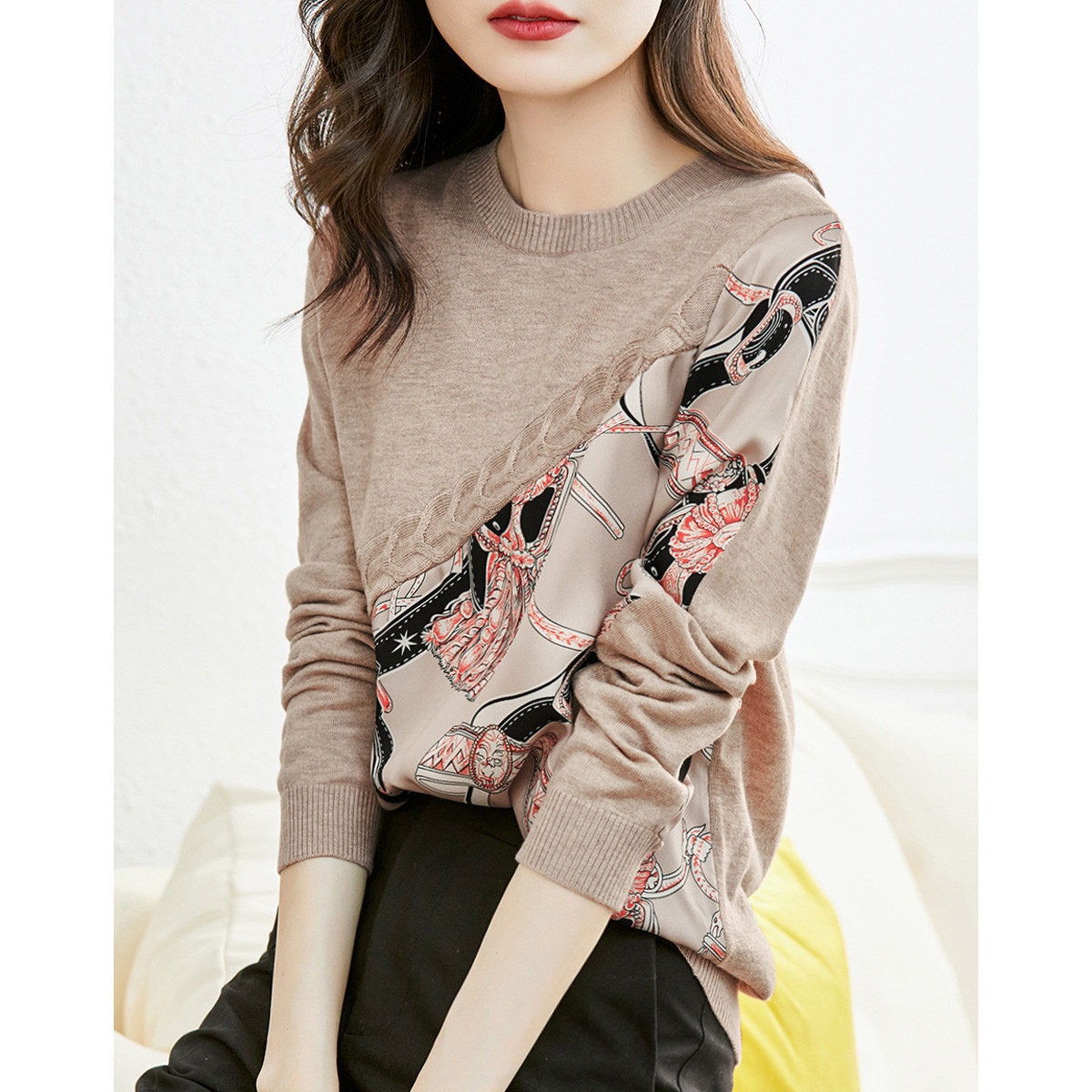 【缎面印花拼接毛衣】春秋新圆领宽松合体通勤女式针织衫女 465473