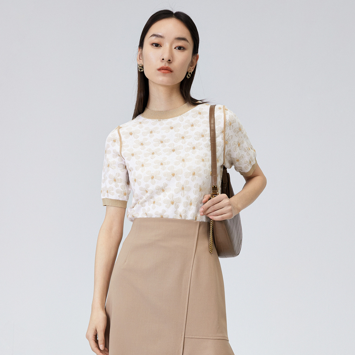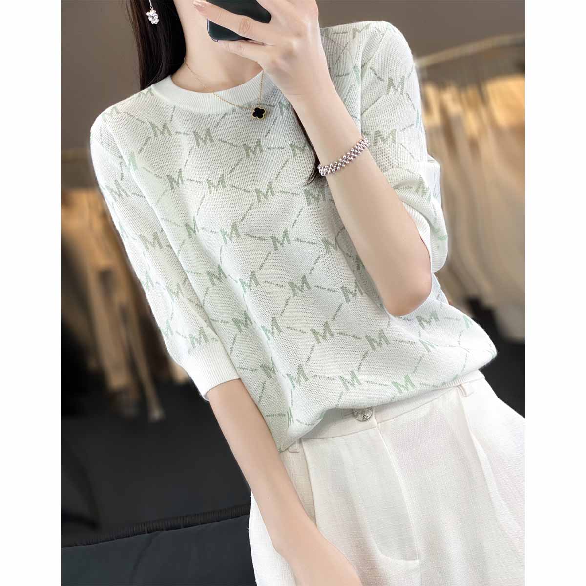 【透爽丝提花字母M线衫】夏季简约通勤圆领短袖针织衫女上衣 347585