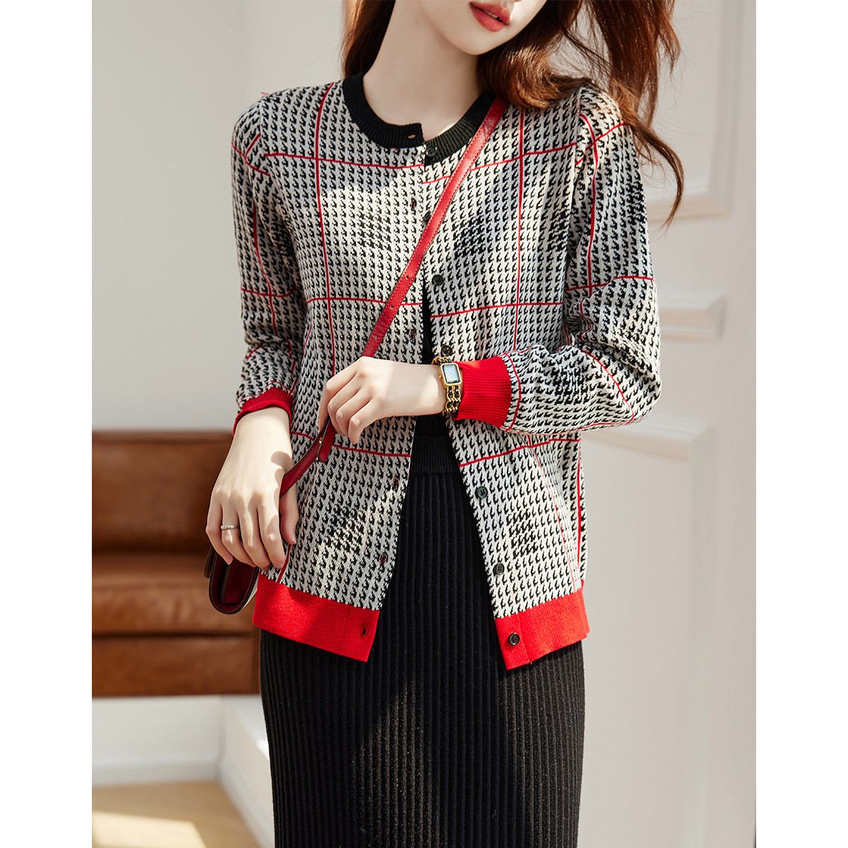 春秋新款高级撞色针织开衫女式气质优雅日常通勤上衣外套 591199