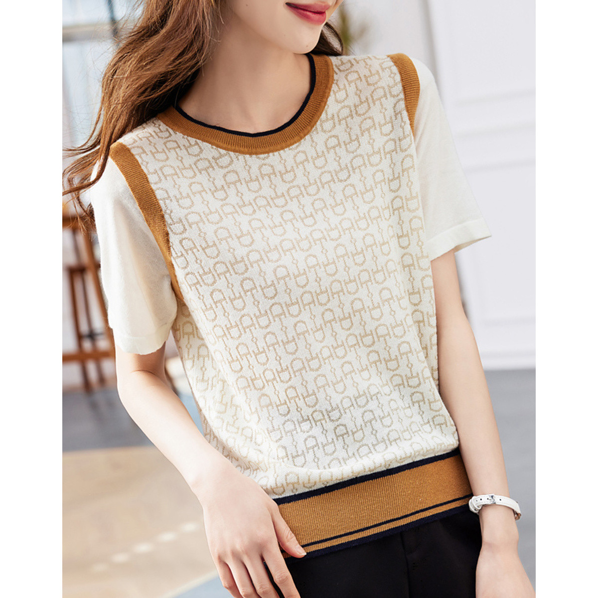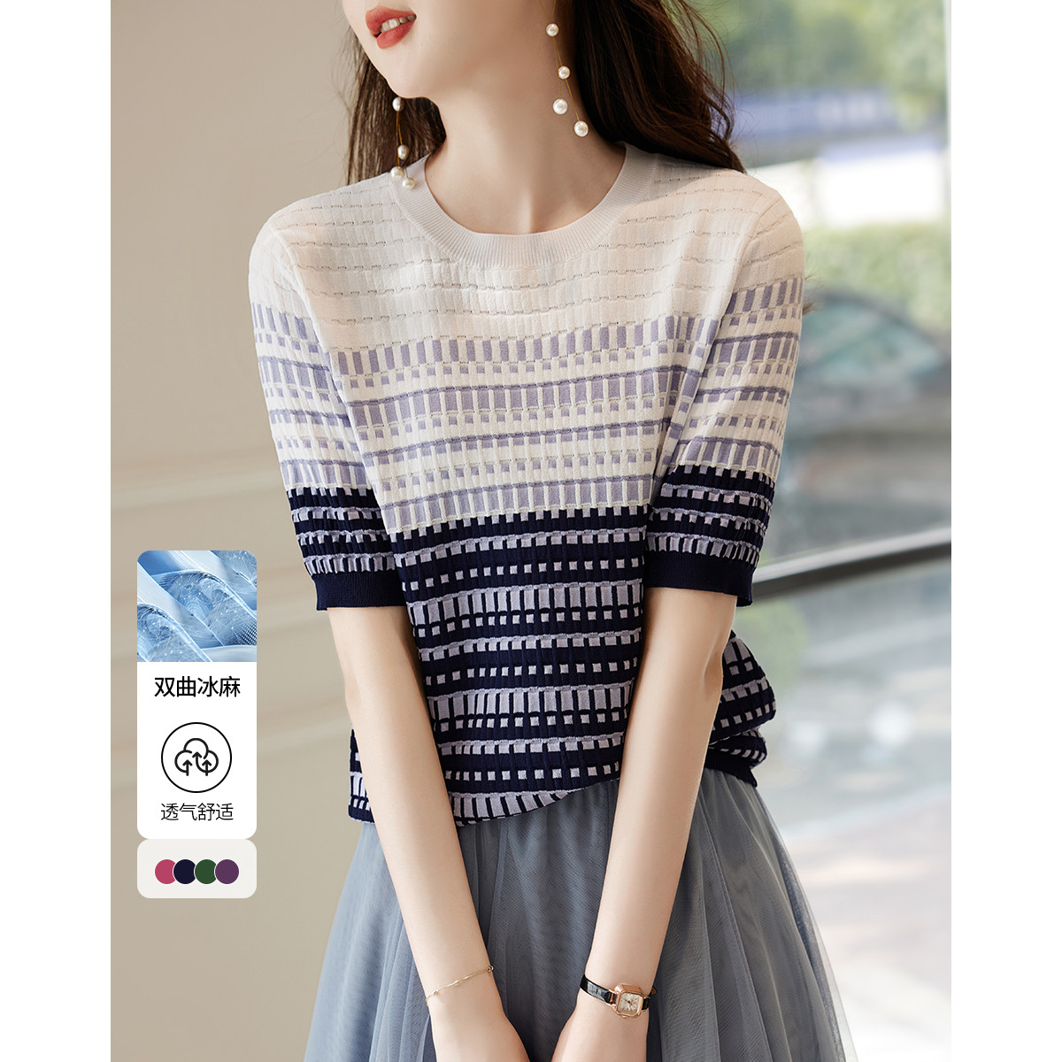 【冰川玫瑰】夏季双曲冰麻线衫圆领撞色提花小个子针织衫女上衣 620737