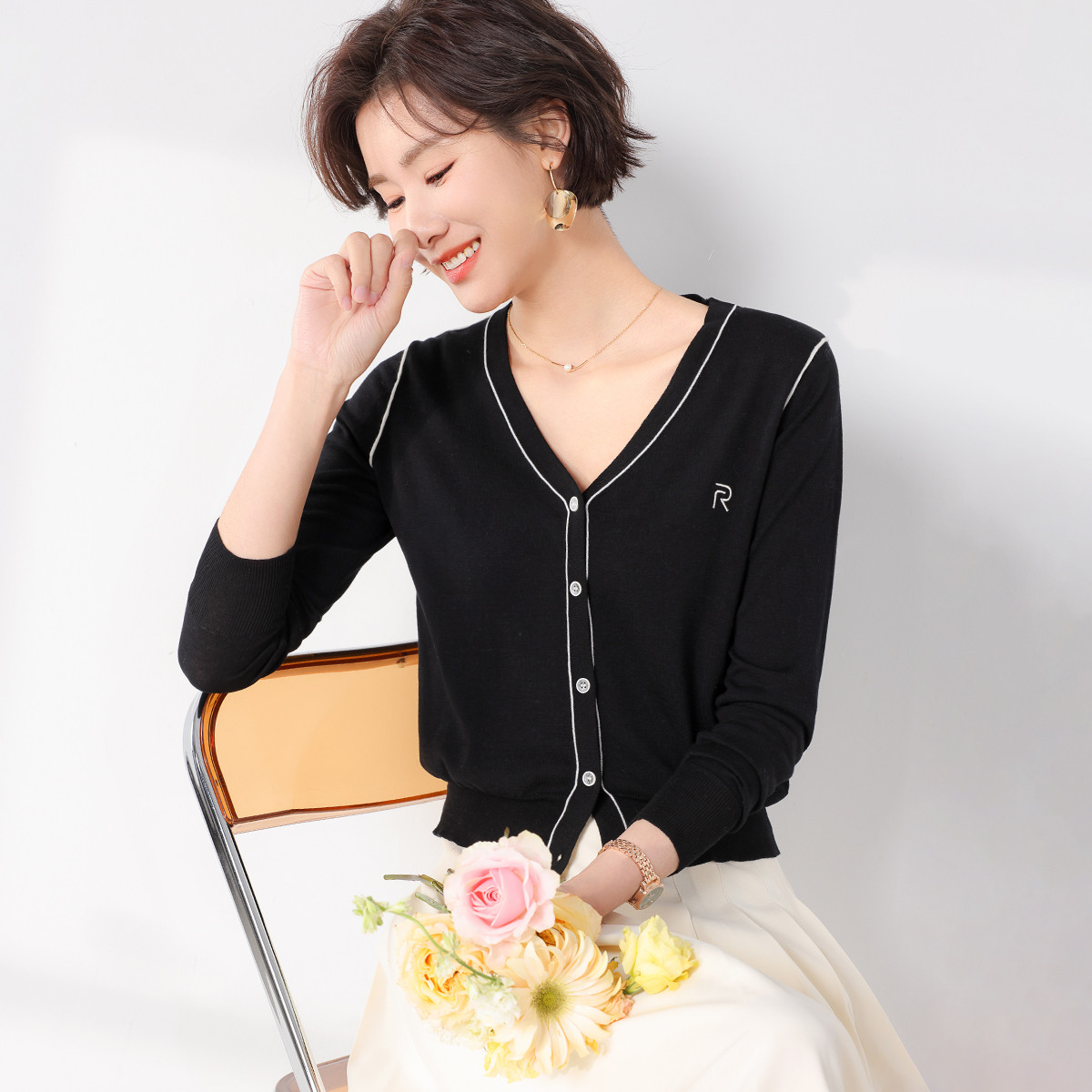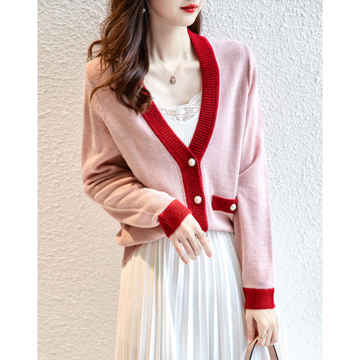 【含绵羊毛绣珠线衫】春秋季V领拼接开衫针织衫女上衣 575489