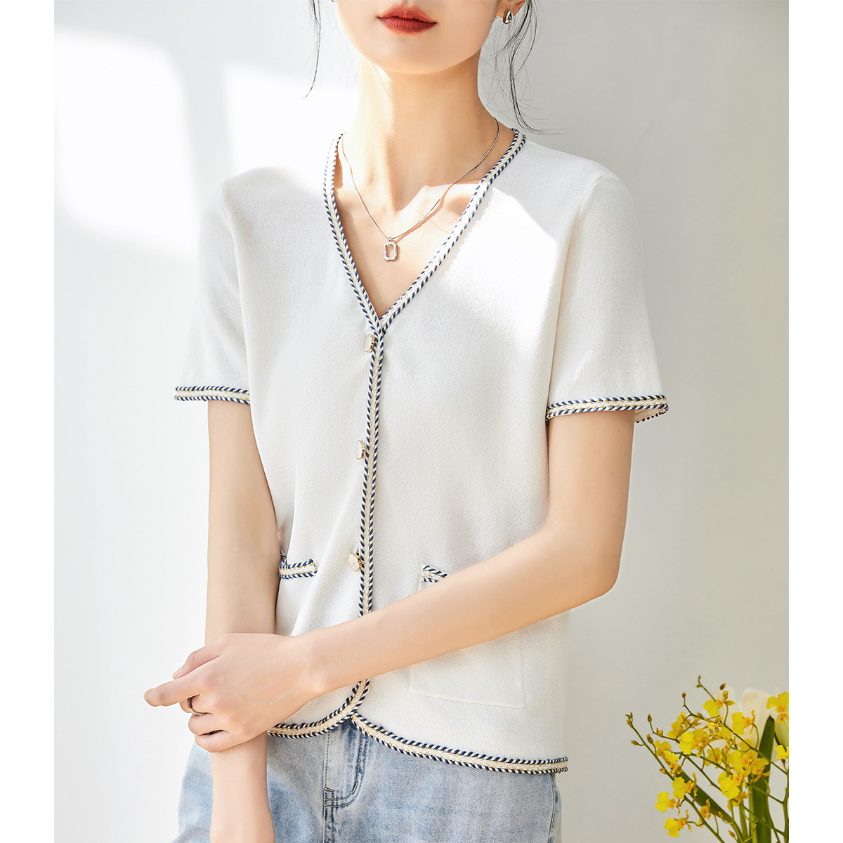 【气质短袖开衫】夏季优雅简约短袖拼接舒适遮肉针织衫女上衣 584129