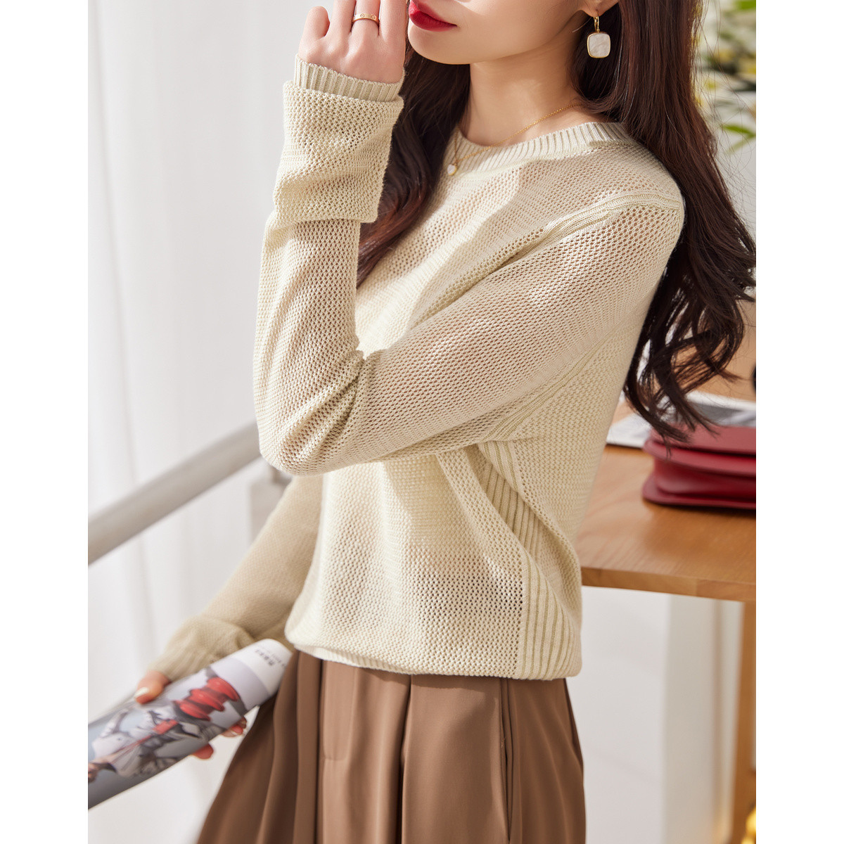 【含绵羊毛】春季通勤圆领长袖镂空针织合体毛衣女春秋款 601409