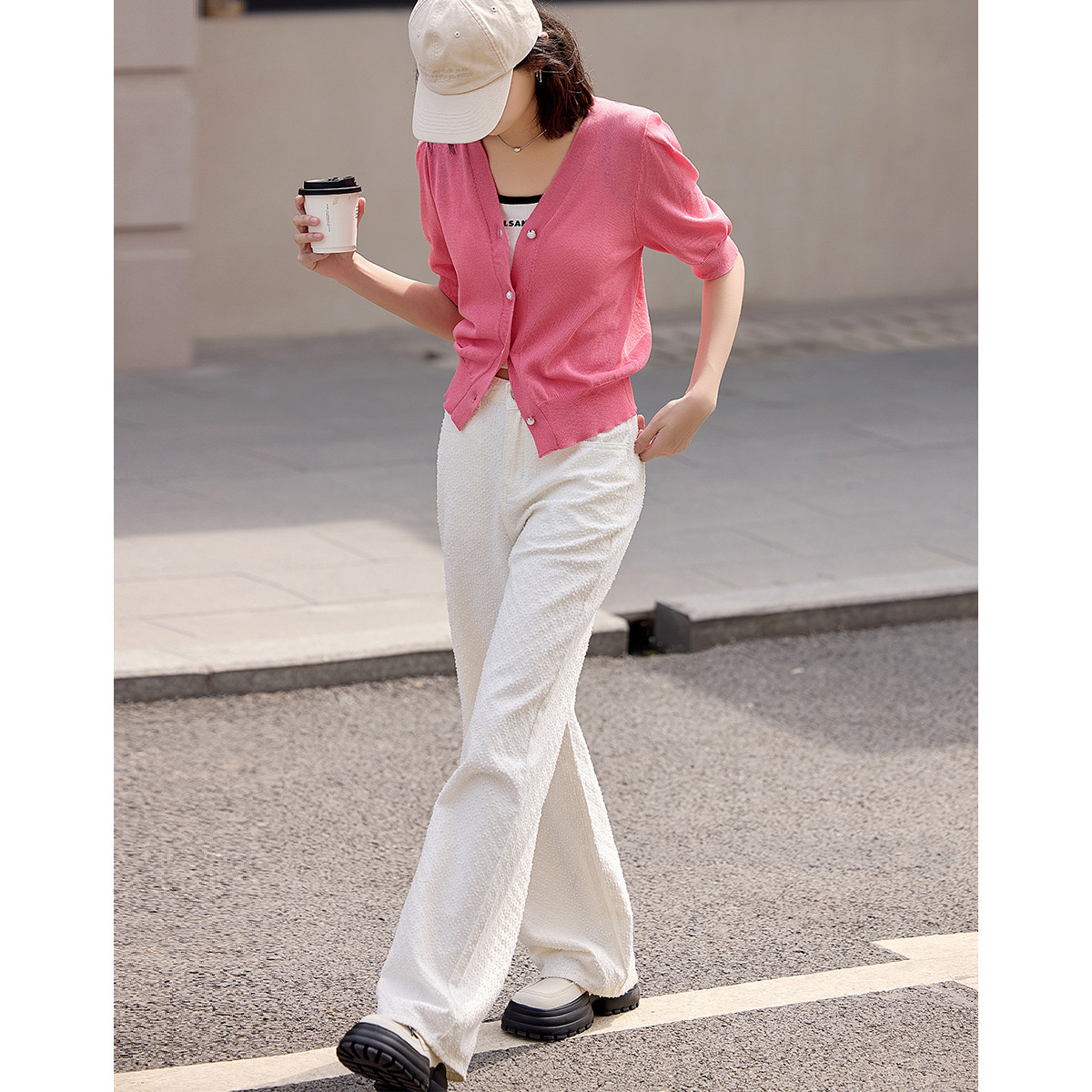 【立体感泡泡袖】夏款短袖V领线衫短袖开衫女 430658