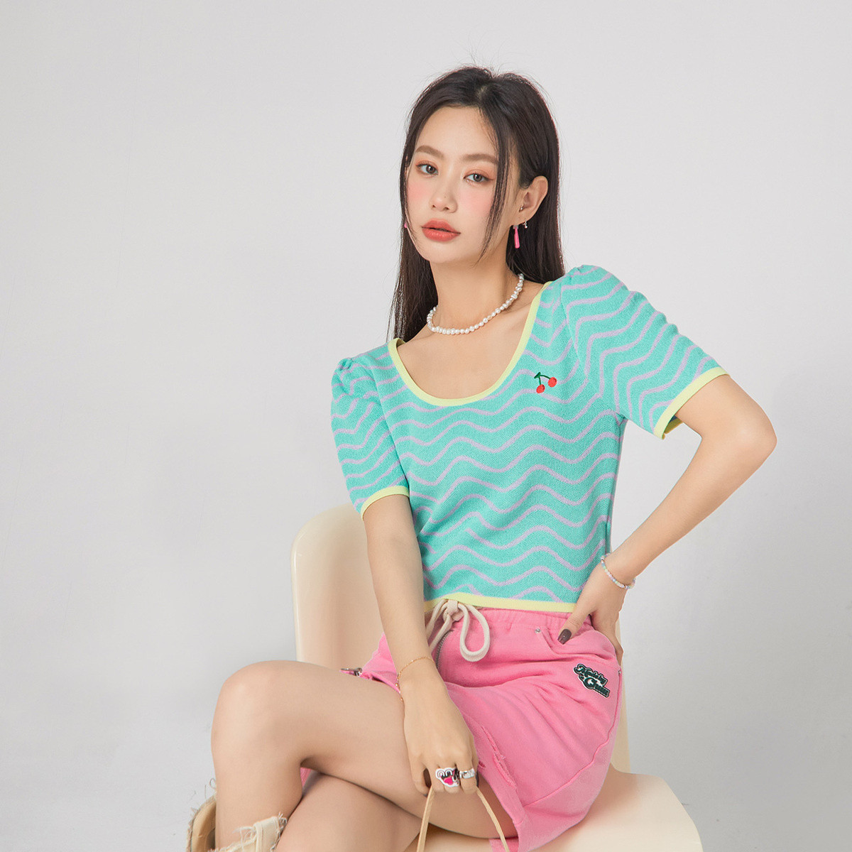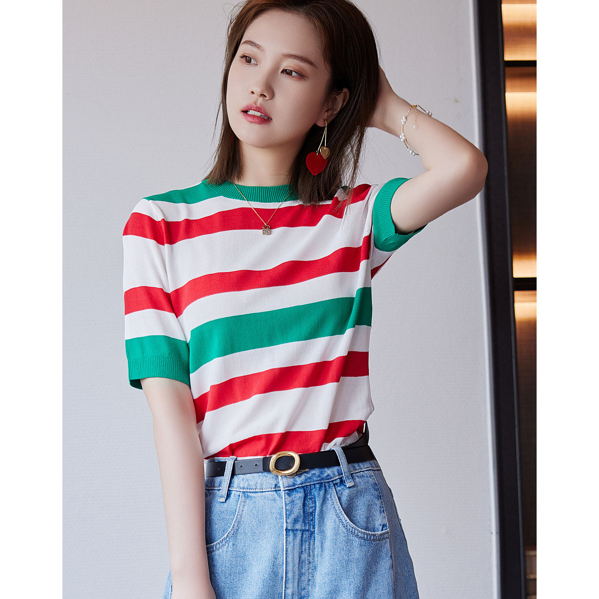 【复古撞色条纹线衫】夏季圆领短袖针织衫女上衣 339841