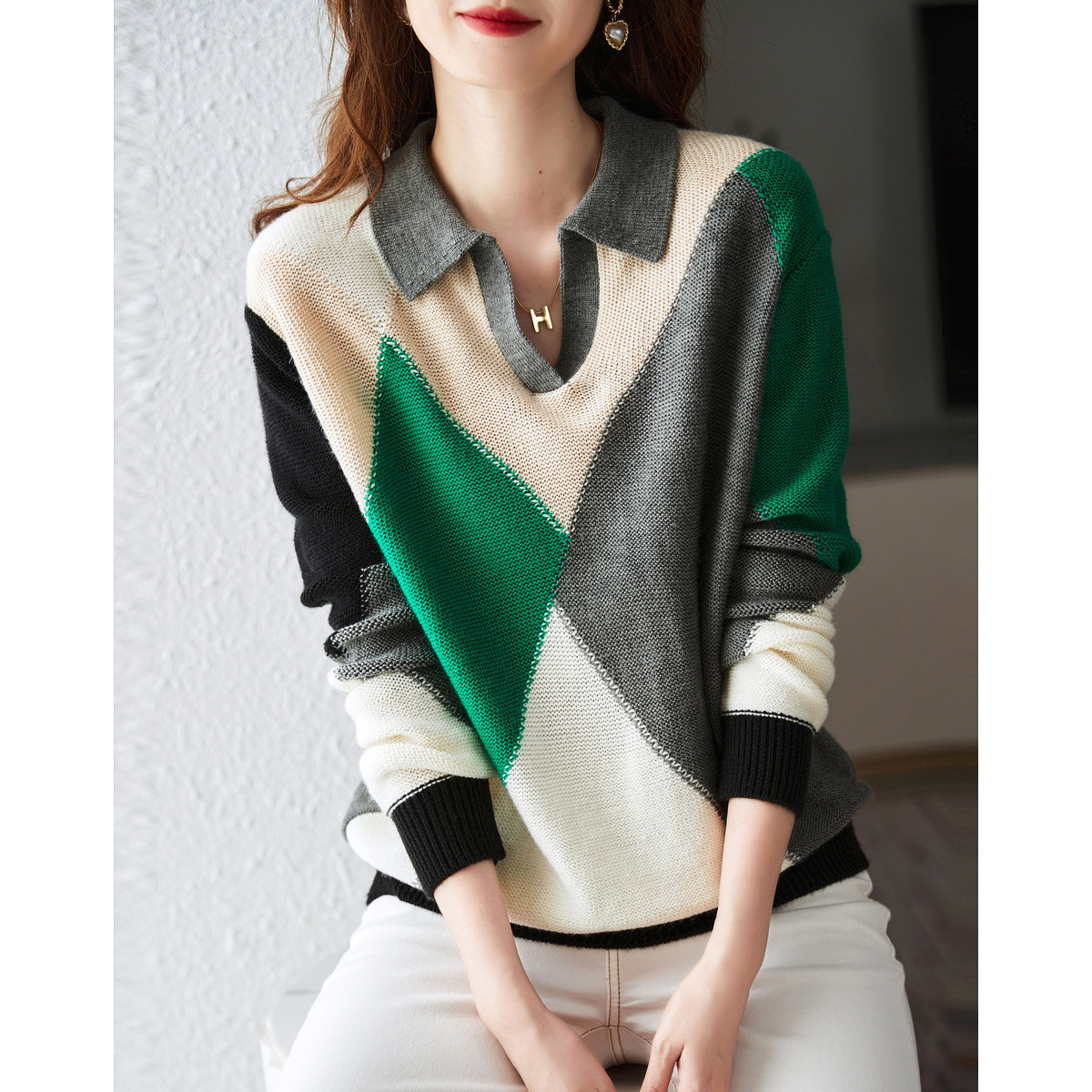 【含绵羊毛拼色毛衣】秋季通勤落肩线衫长袖针织衫女上衣 666753