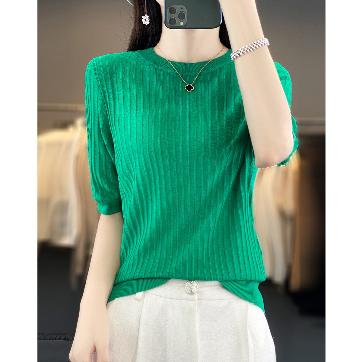 【冰感轻薄线衫】春季圆领短袖弹力针织衫女上衣 004033