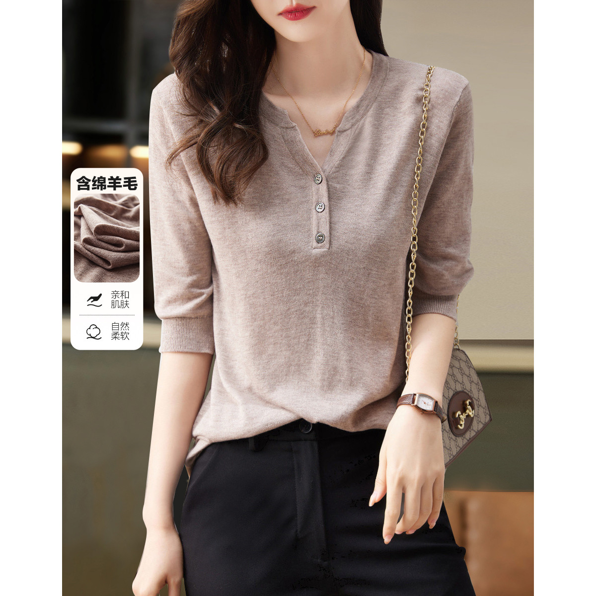 【薄荷奶酪】夏季含绵羊毛半开领线衫五分袖小个子针织衫女上衣 070721