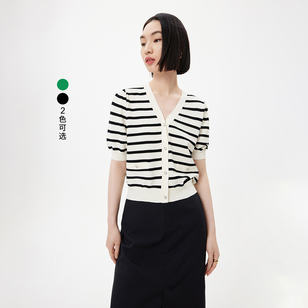 【薄荷曼波】针织衫女春季复古简约条纹优雅V领修身针织开衫 459803