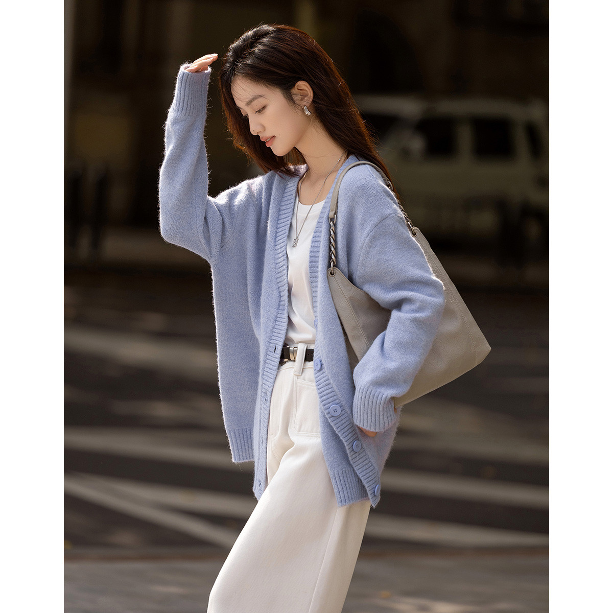 【温柔浅紫】冬季款慵懒软糯V领针织开衫宽松毛衣女 654210
