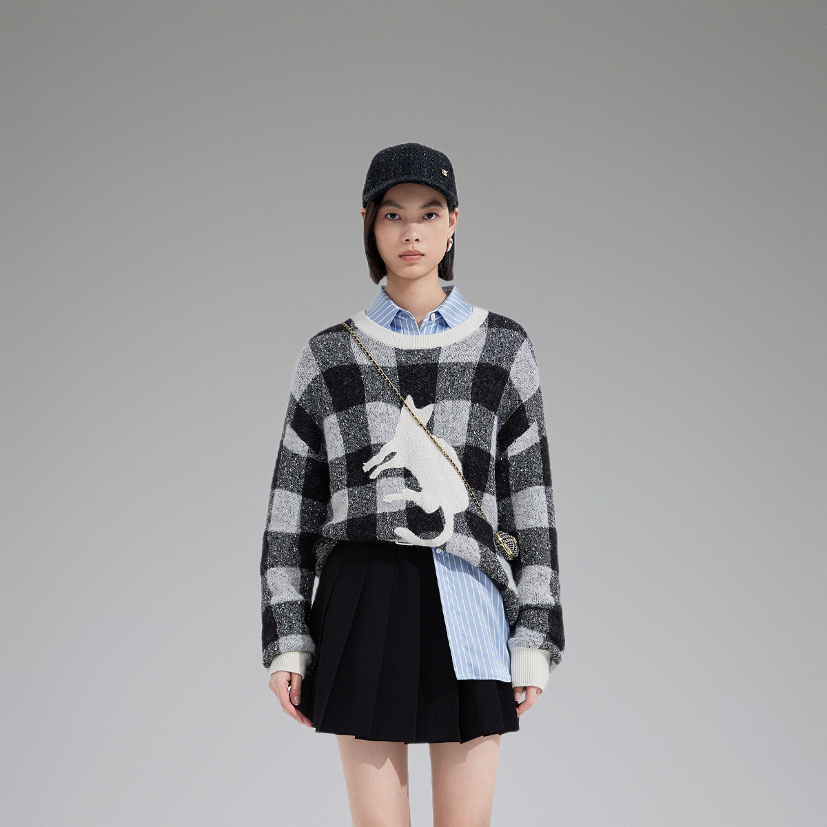 黑标系列春装 撞边章仔格子中长宽松慵懒风毛衣女 658959