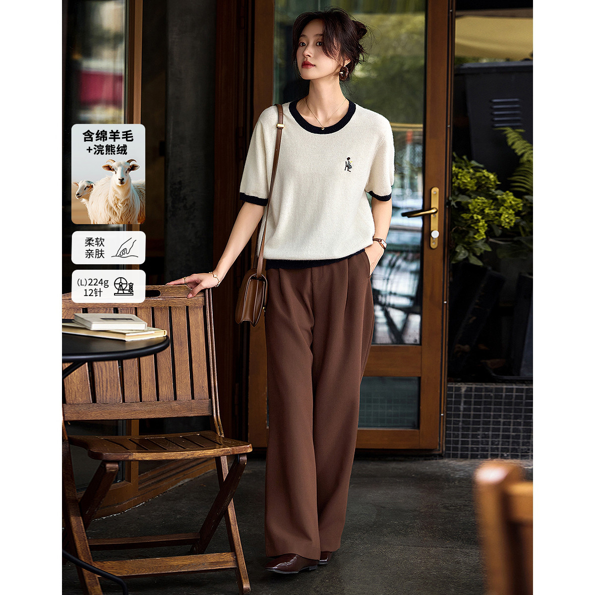 【含绵羊毛】撞色刺绣设计羊毛薄款短袖舒适百搭羊毛衫套头针织衫 740225