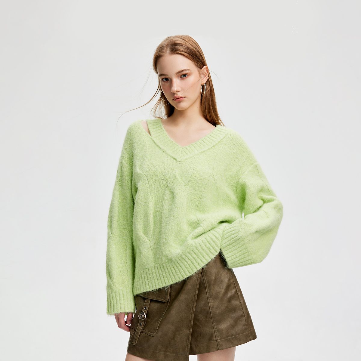 【绞花设计】春季设计感V领宽松长袖纯色针织衫女 189786