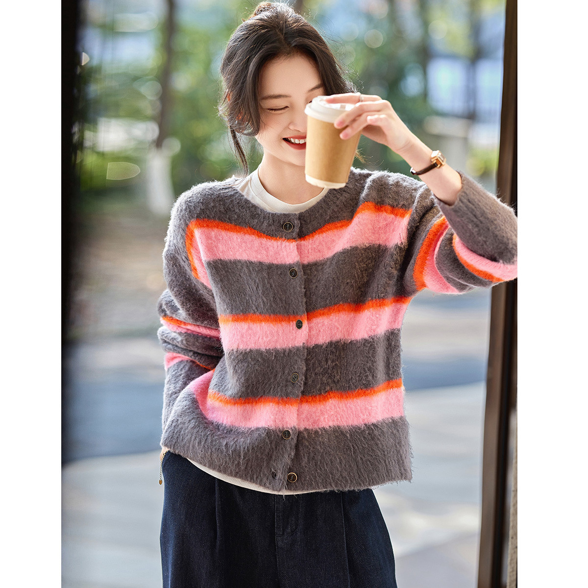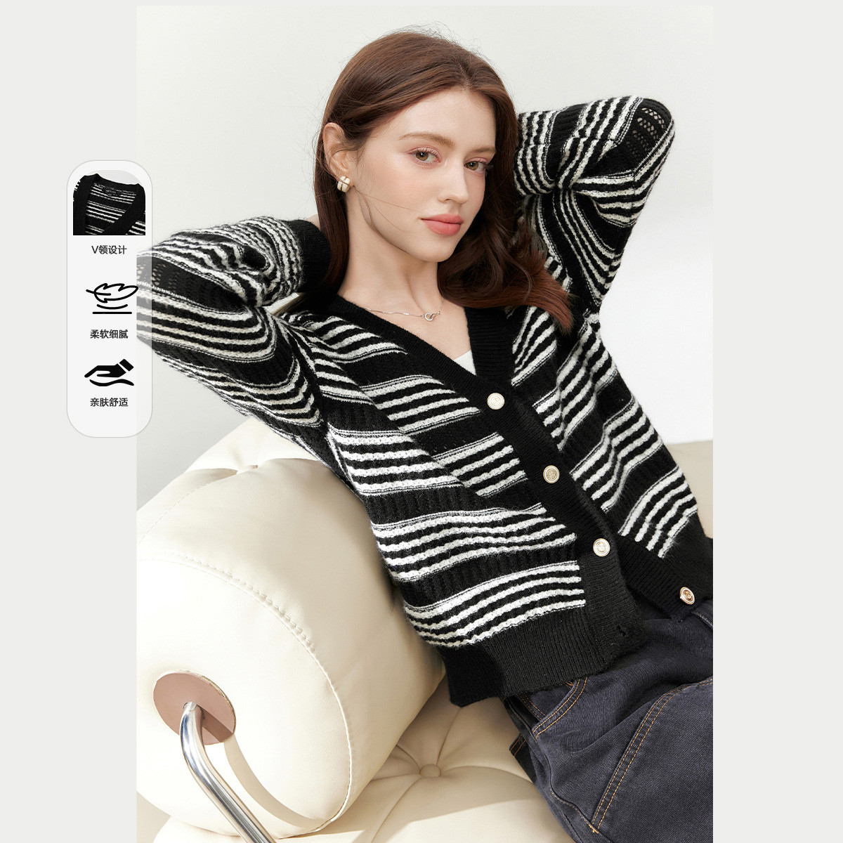 【2024秋季】简约气质粗条纹V领针织开衫毛衣慵懒风外套女 865748