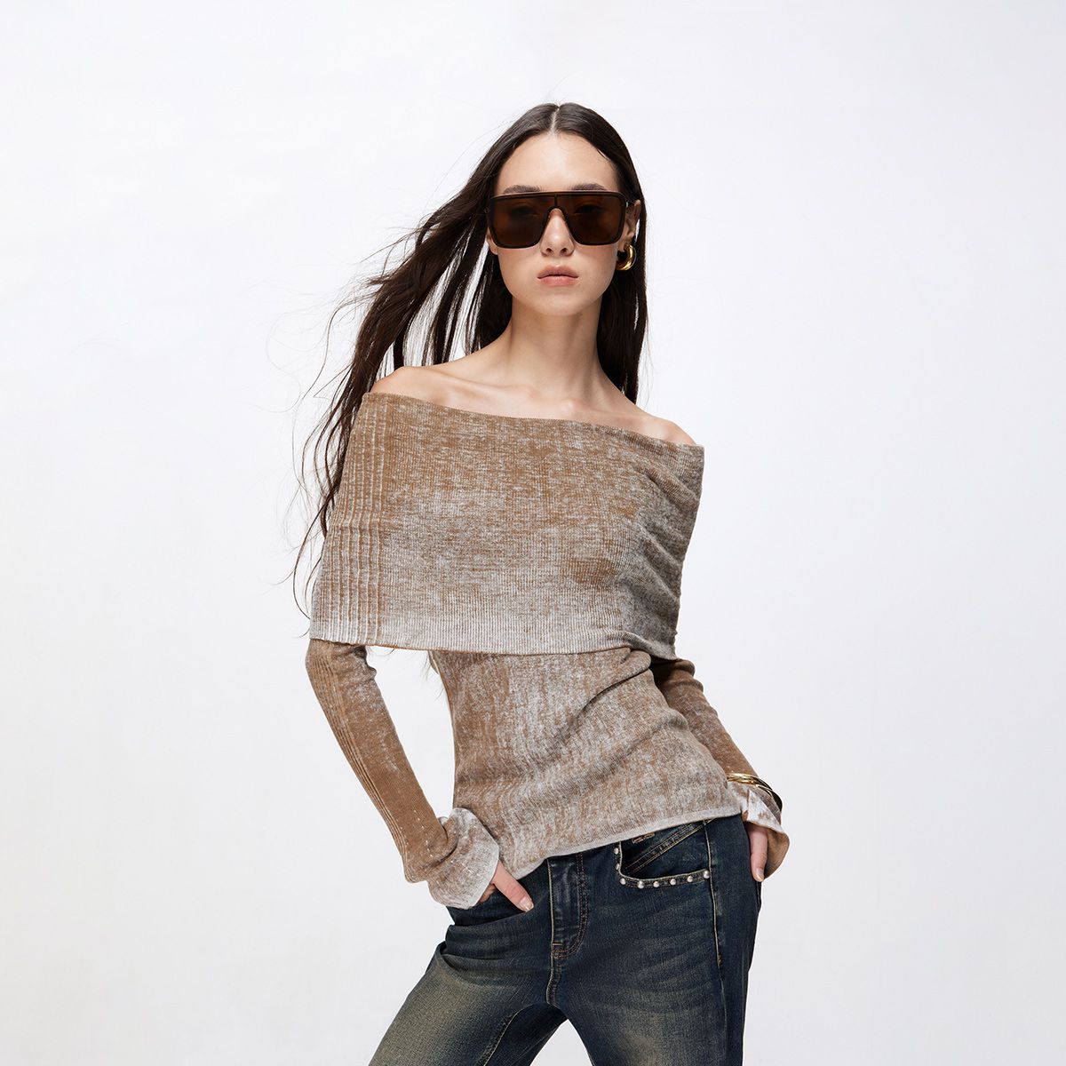 【一字肩】春季时尚优雅做旧纯棉修身一字肩针织衫女 904282