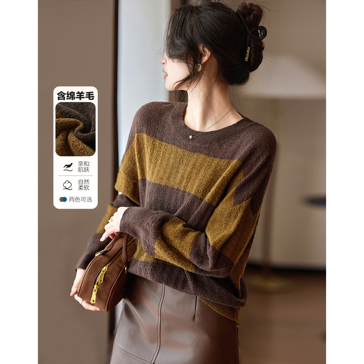 【线条美学】春多巴胺条纹撞色线衫含绵羊毛舒适藏肉针织衫女上衣 217921