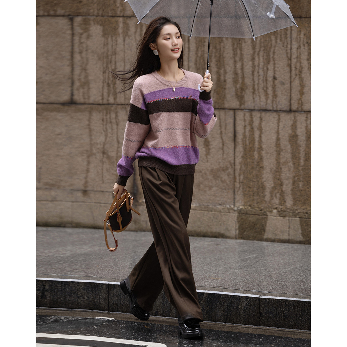 春秋款纯绵羊毛条纹小翻领拼色设计感修身套头针织衫朗姿集团 001497
