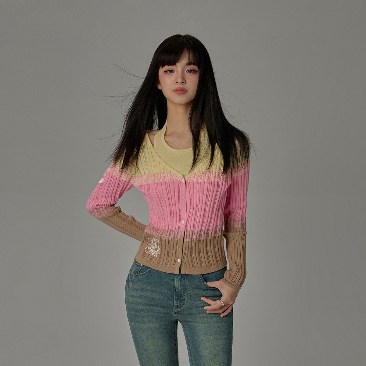 【纯色开衫】针织衫女开衫长袖坑条简约格雷灰韩系 195473