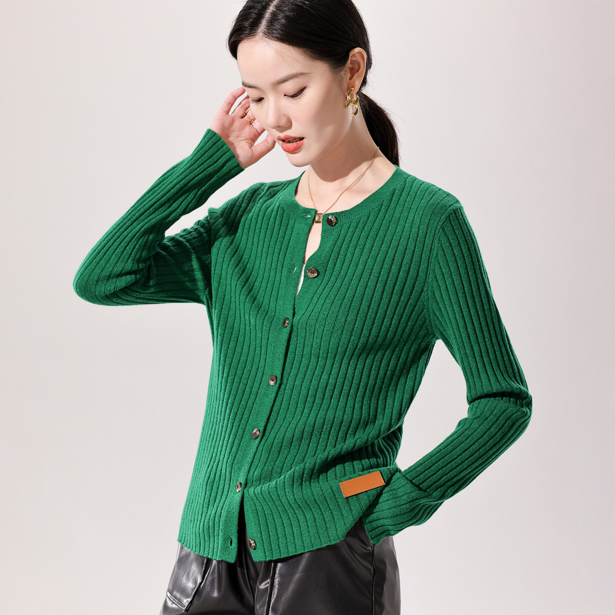 【100%绵羊毛】圆领抽条羊毛开衫纯色气质百搭针织毛衣外套 214163