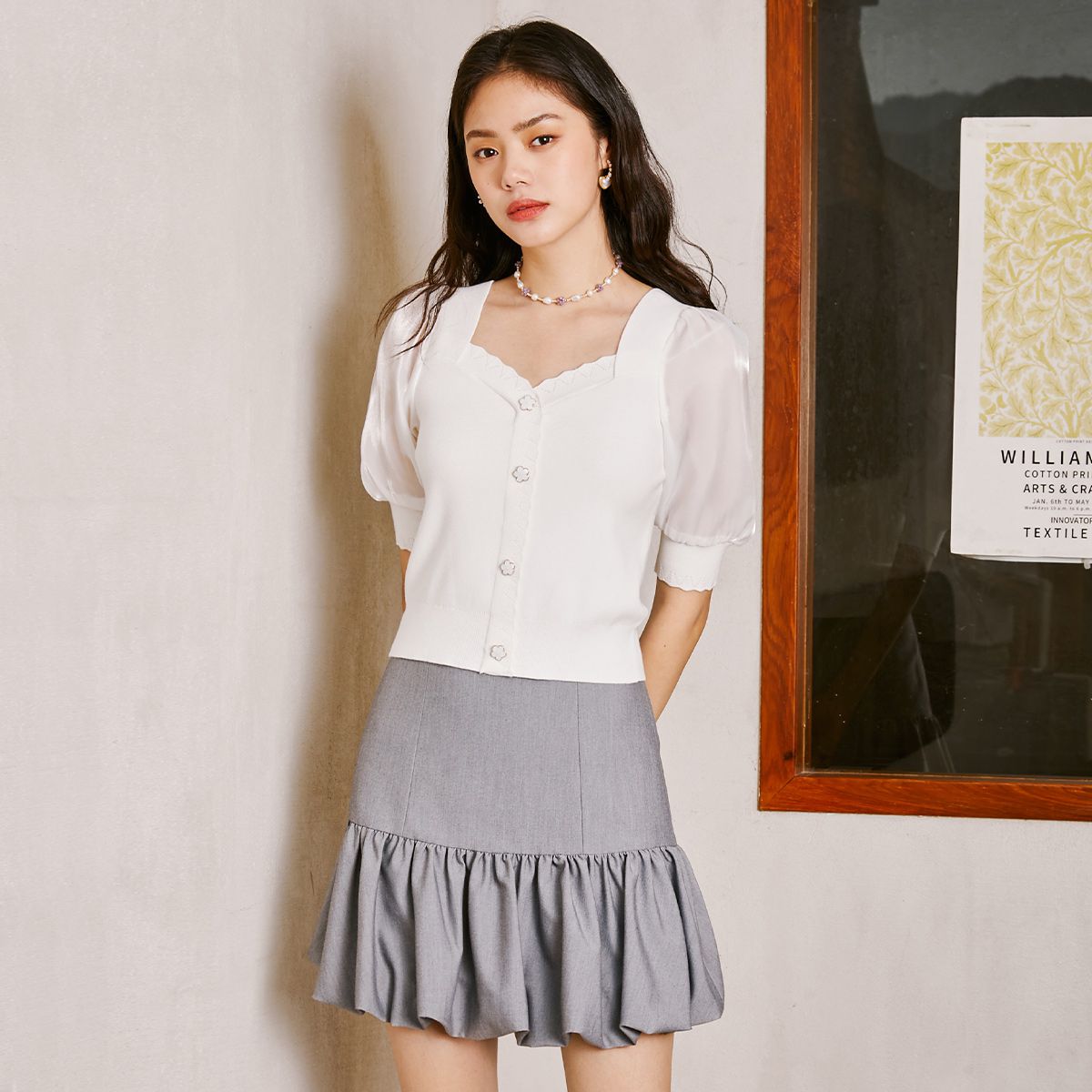 【淑女泡泡袖】春季花朵拼接套头短袖针织衫女 736986