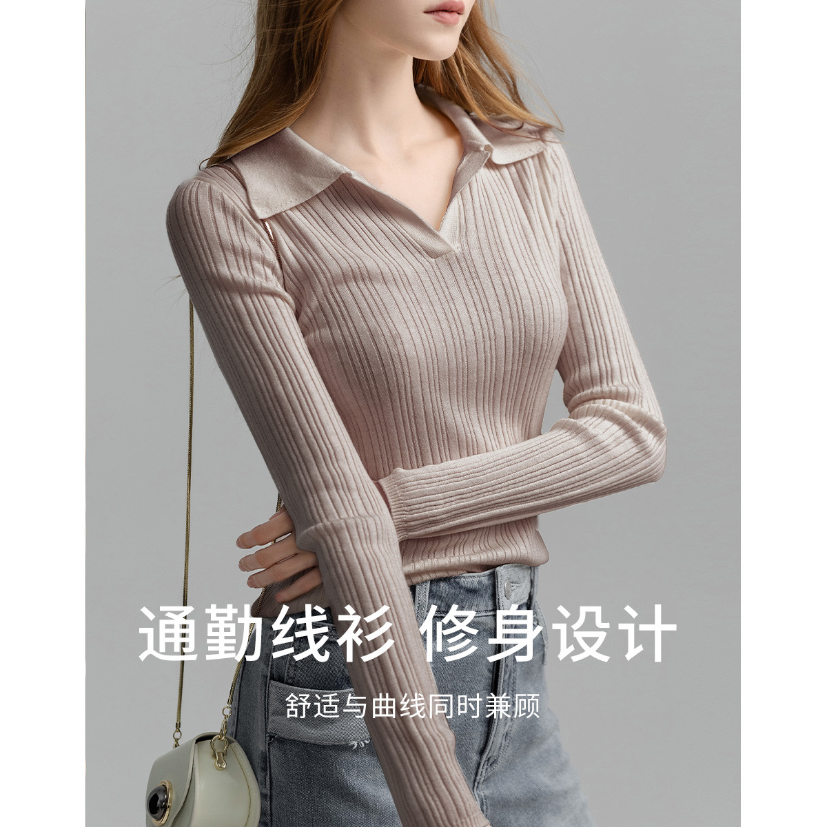 【简约风通勤】春秋法式坑条翻领线衫微弹修身舒适针织衫女式上衣 168449