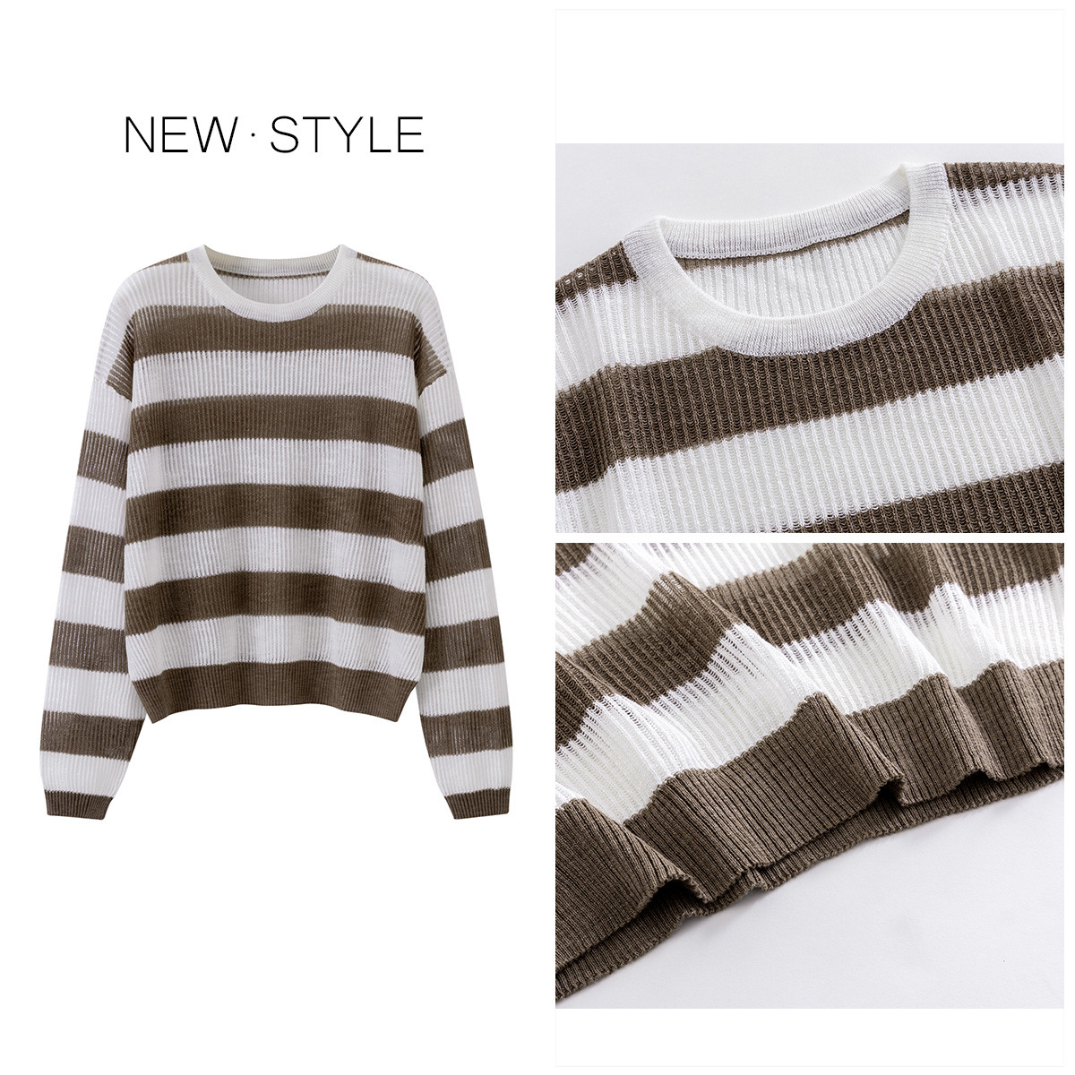条纹简约慵懒镂空冰丝宽松针织衫圆领长袖薄款空调服上衣女 367107