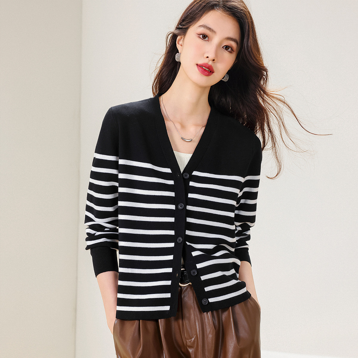 V领含羊毛针织打底开衫女条纹女式毛衣外套 720147