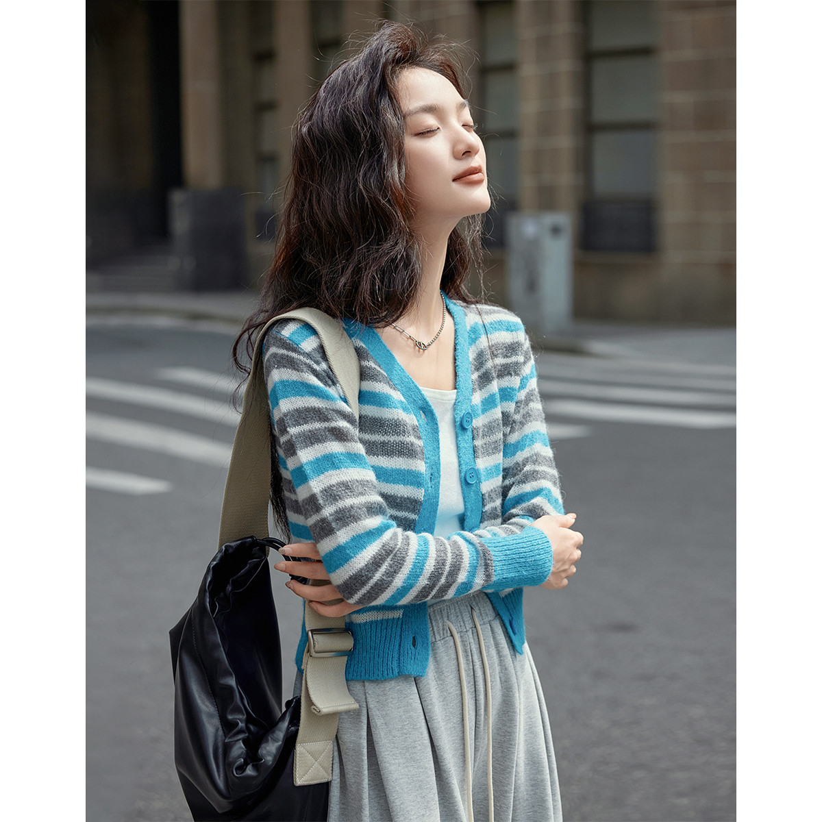【纯色开衫】针织衫女开衫长袖坑条简约格雷灰韩系 195473