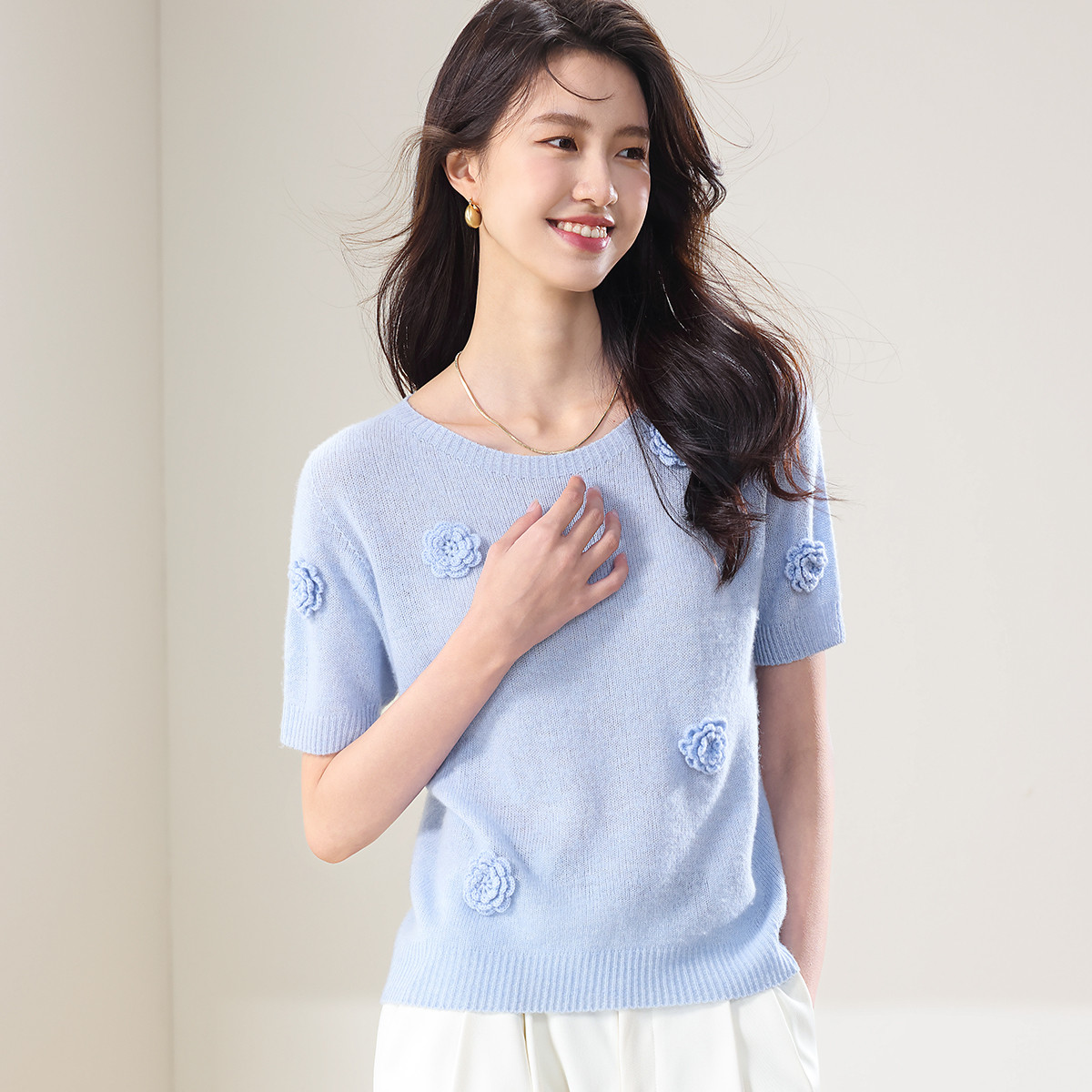 圆领纯色针织衫女春装上衣立体花朵短袖羊毛衫高级感女式T恤 838931