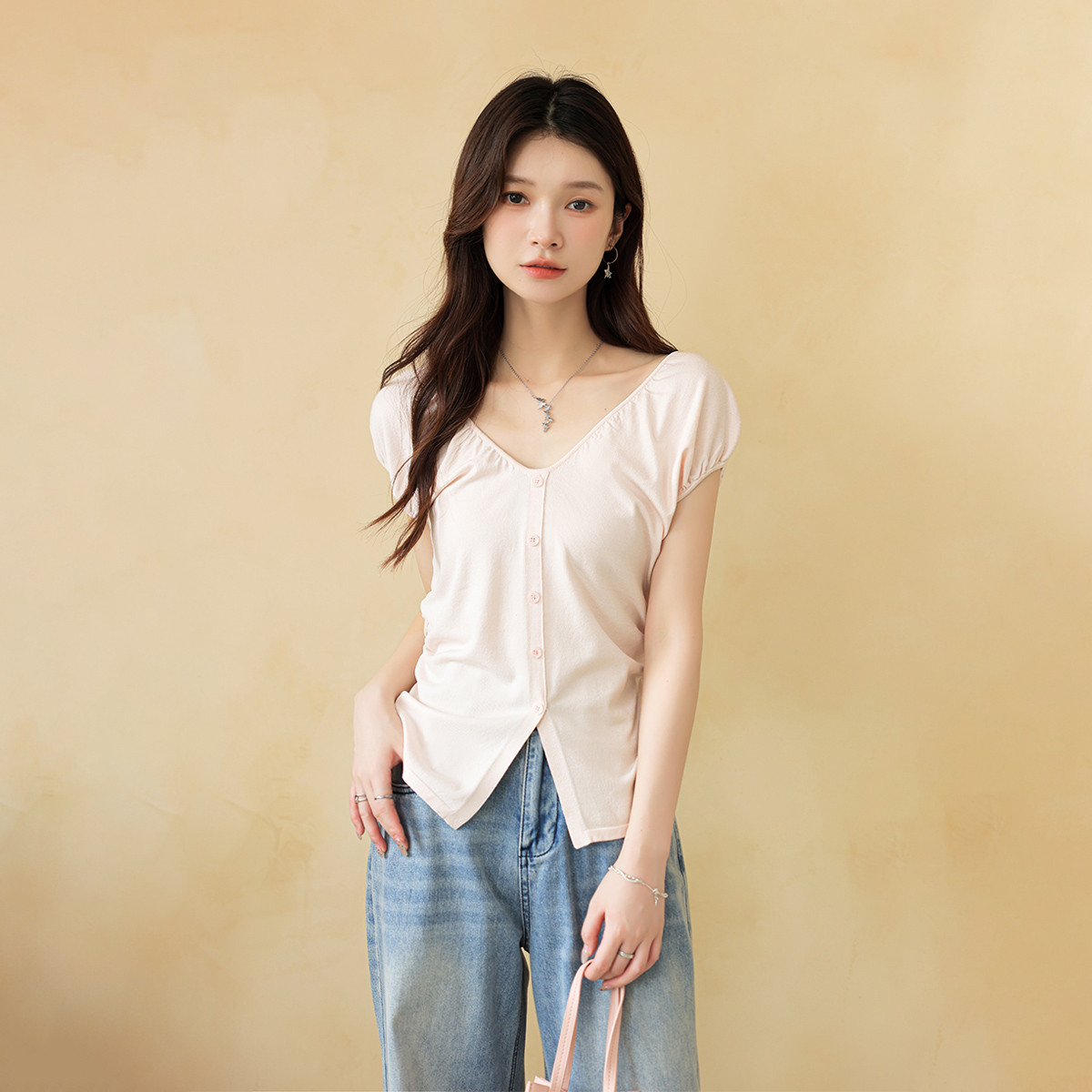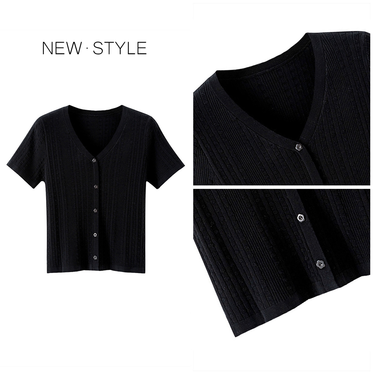 法式V领小衫假纽扣设计感修身甜美短袖针织衫 401859