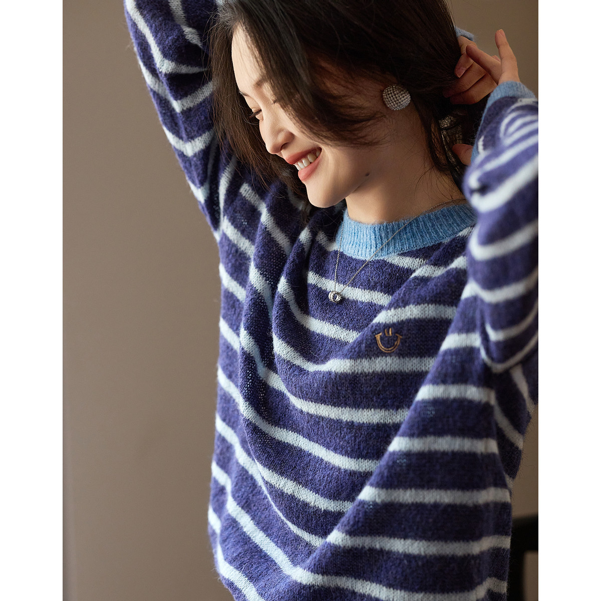 【学院风经典蓝条纹】秋显白撞色落肩袖设计感舒适上衣女 351170