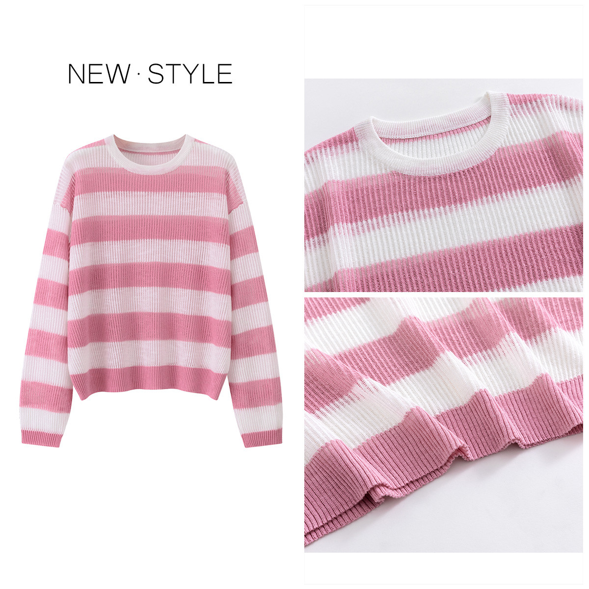 条纹简约慵懒镂空冰丝宽松针织衫圆领长袖薄款空调服上衣女 416259