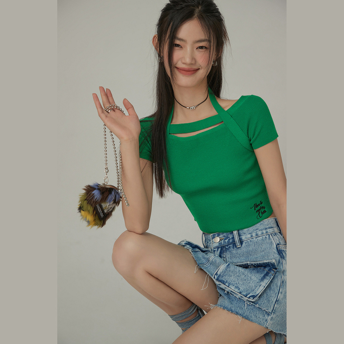 CHUU字母刺绣针织衫女夏设计感别致挂脖短袖上衣 553811