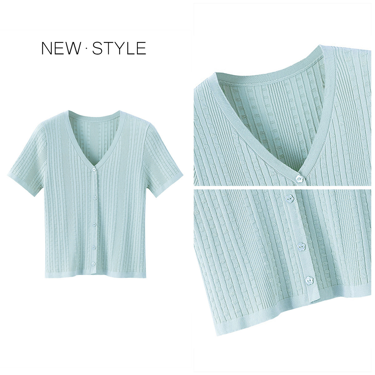 简约纯色短袖V领开衫冰丝清凉针织衫薄款镂空宽松显瘦上衣女 285187