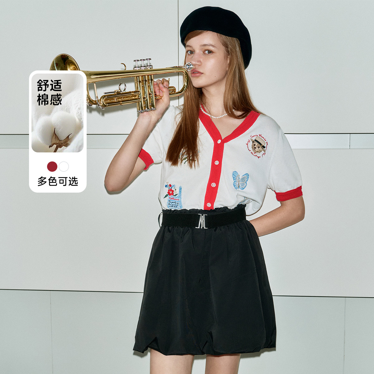 小熊夏季款V领短袖针织开衫薄款时尚设计感女士 954113