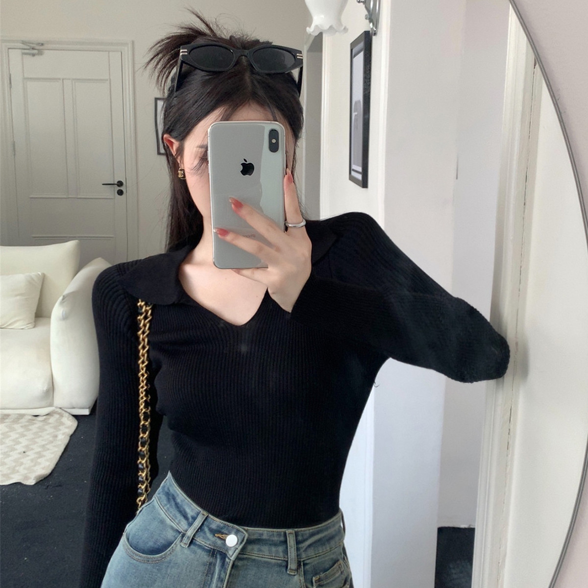 小众长袖针织衫打底上衣女翻领长袖针织衫 783363