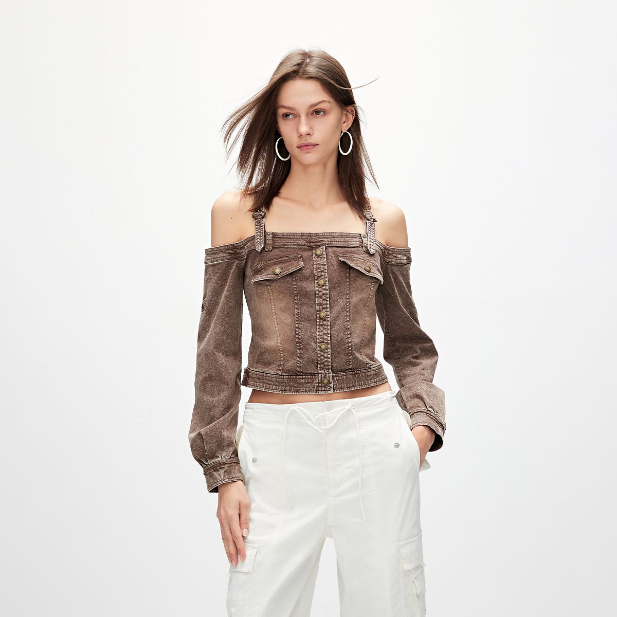 【性感辣妹风】春季两穿露肩短款蕾丝衫女 680858