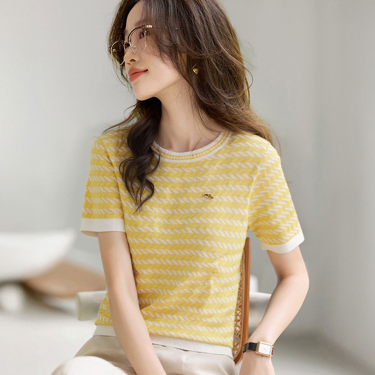 【法式小香风】V领短袖针织衫女士减龄薄款夏季气质短袖衫上衣女 370207