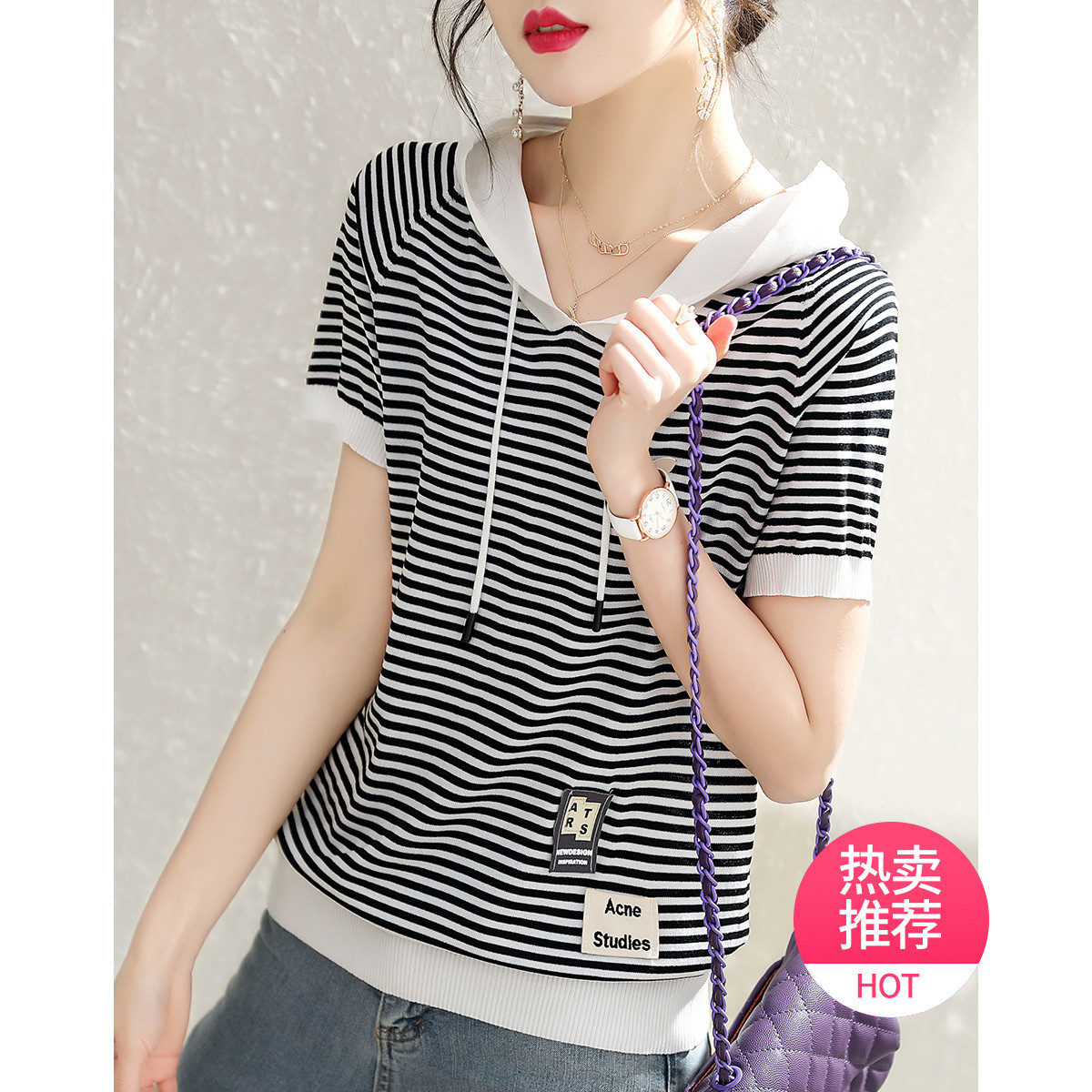 【福利钜惠】连帽短袖T恤2025夏季新款拼色条纹百搭针织衫 800521