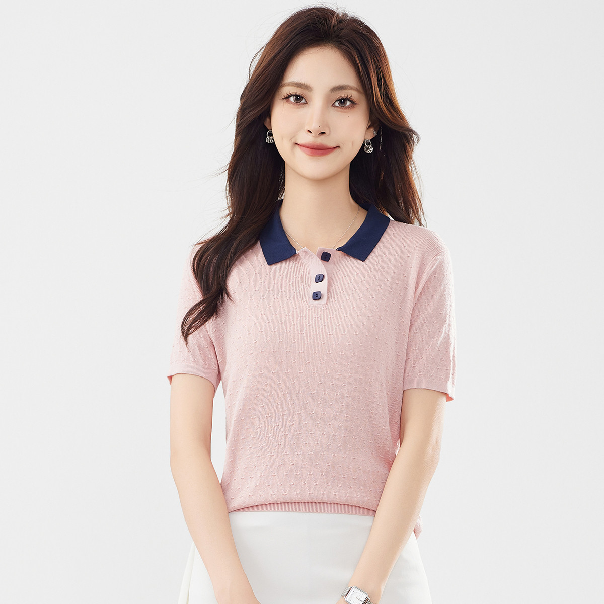 【100%莱赛尔】简约高级感撞色翻领针织衫休闲百搭短款上衣女 320607