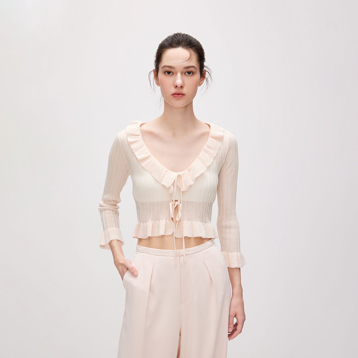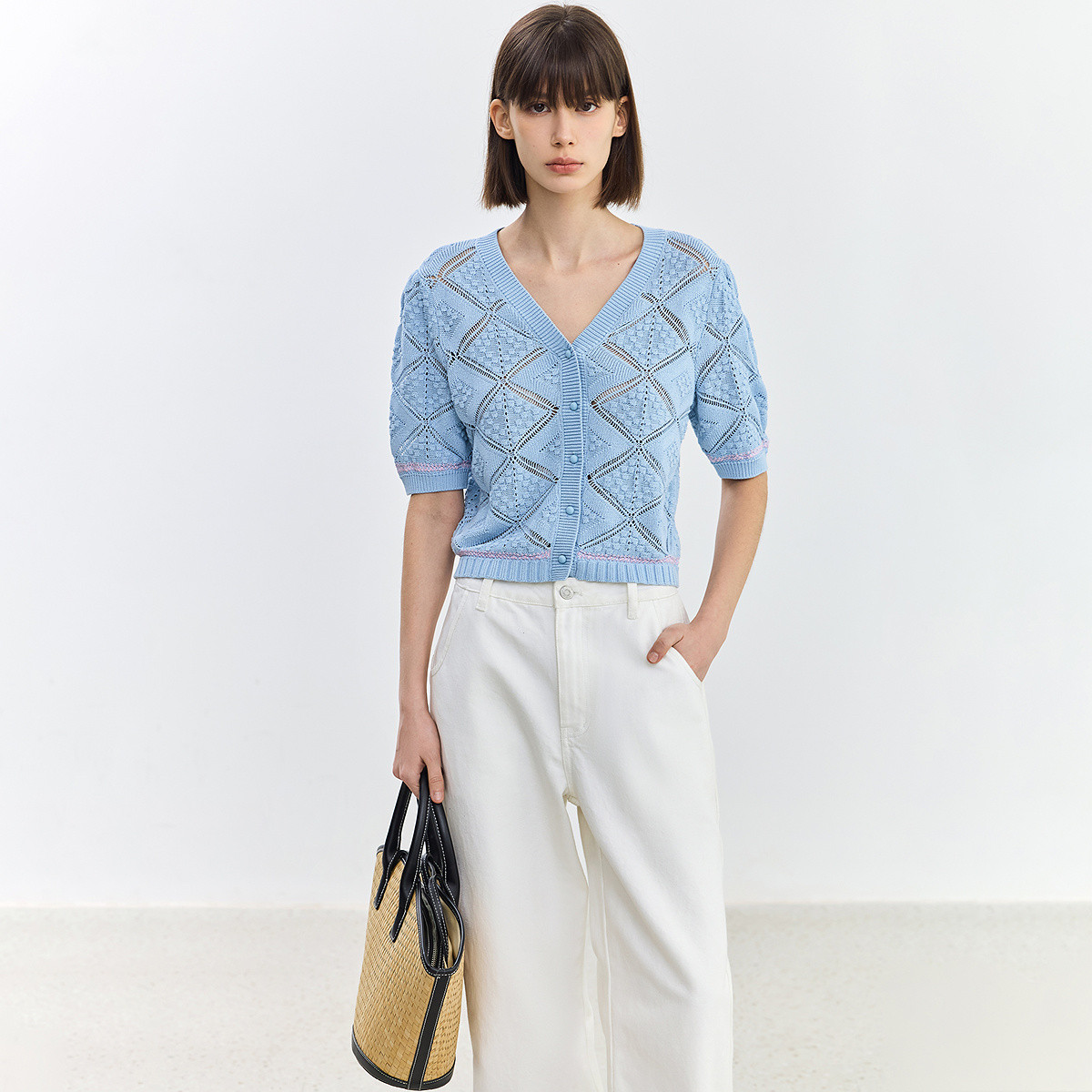 【薄荷曼波】春季款气质通勤设计感镂空修身短款针织开衫外套女 473371