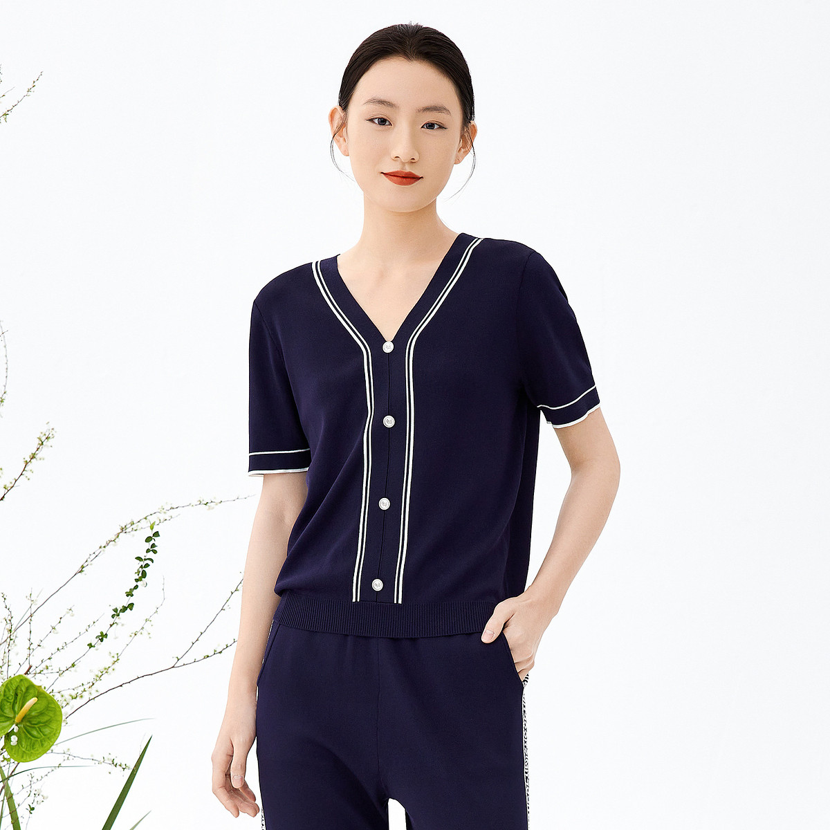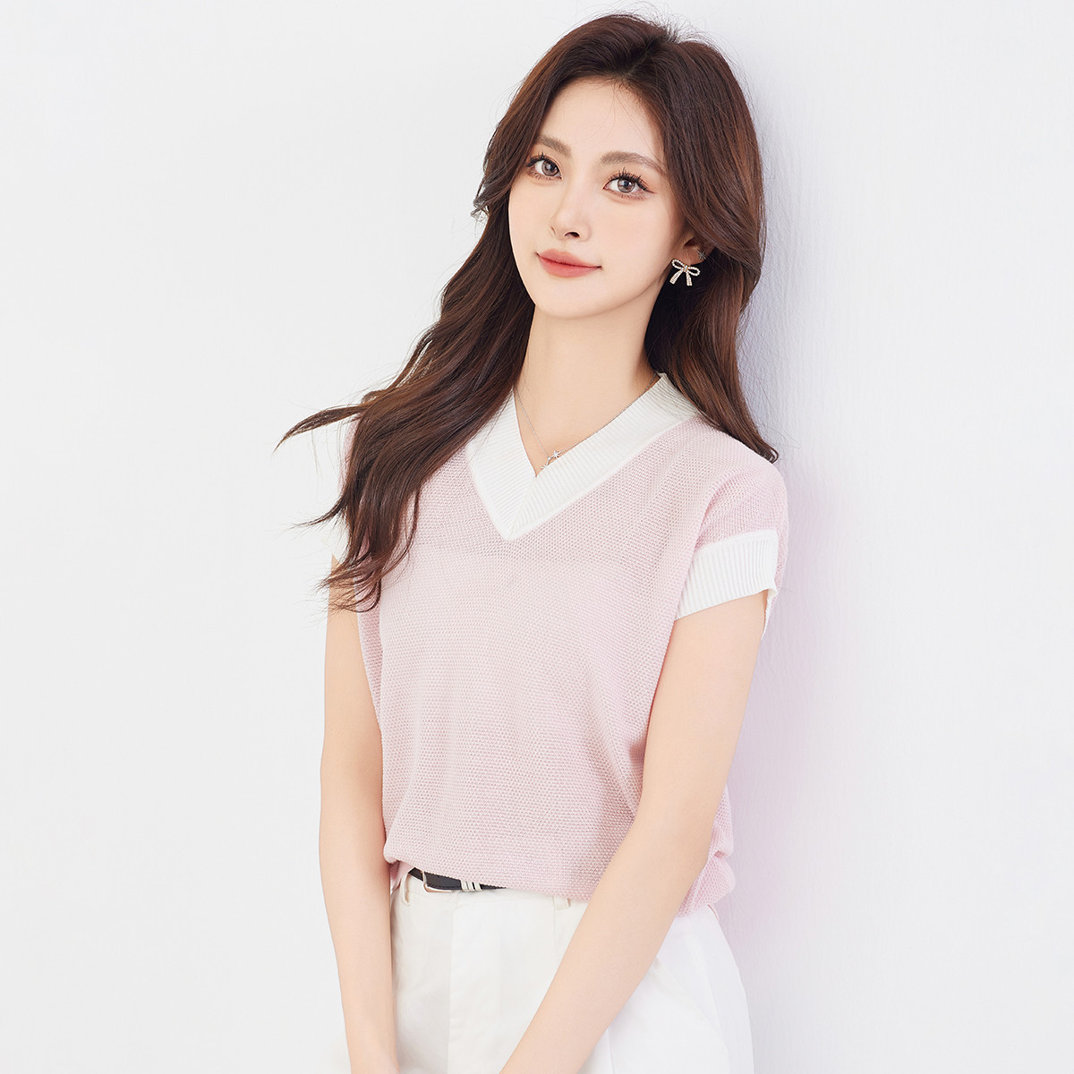 【100%莱赛尔】气质V领撞色针织衫女简约高级感休闲百搭短袖 902239