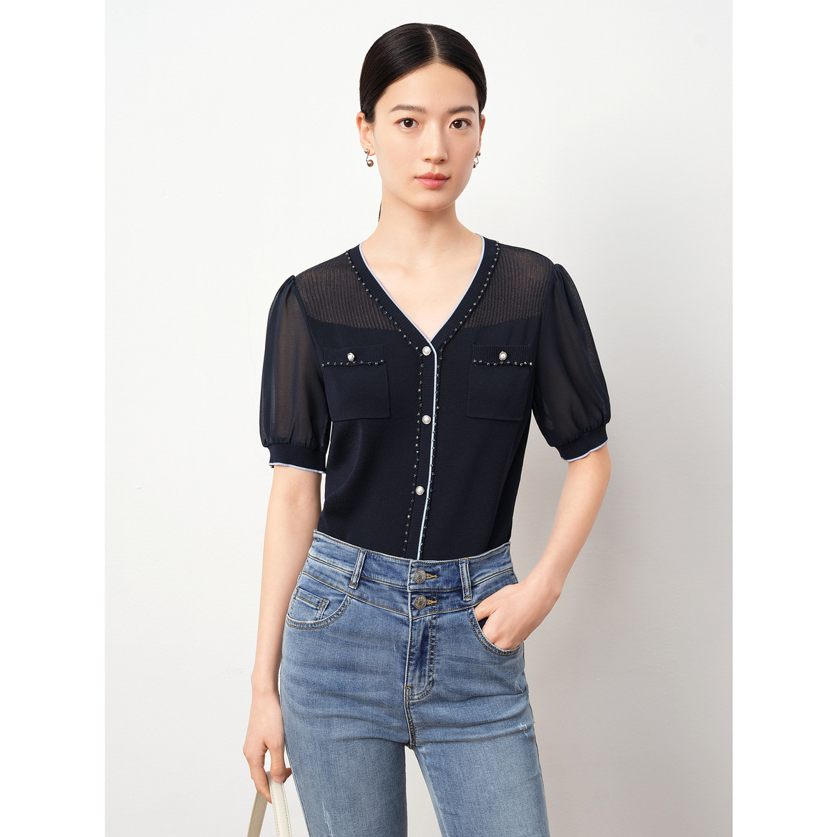 商场同款JZ玖姿轻熟V领雪纺拼接套头针织衫夏季JWDX31218 499468