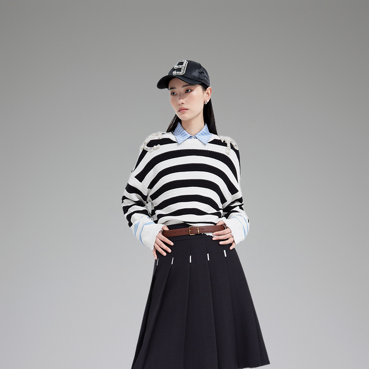 春装 手钉珍珠亮钻法式条纹慵懒风针织衫女 617615