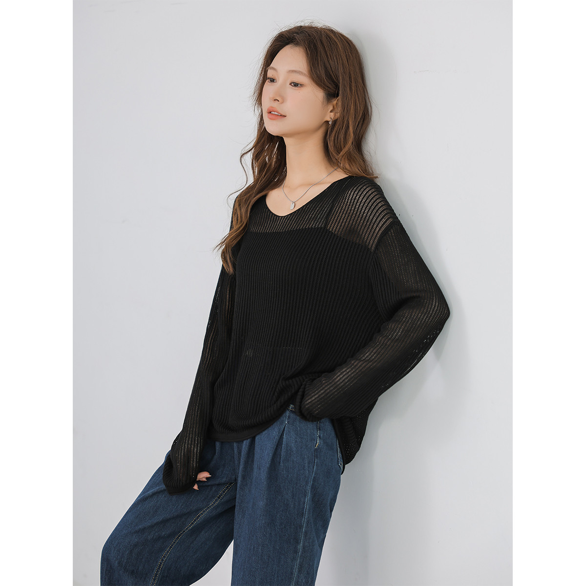 冰丝镂空V领针织衫女宽松显瘦百搭外穿针织上衣 772163