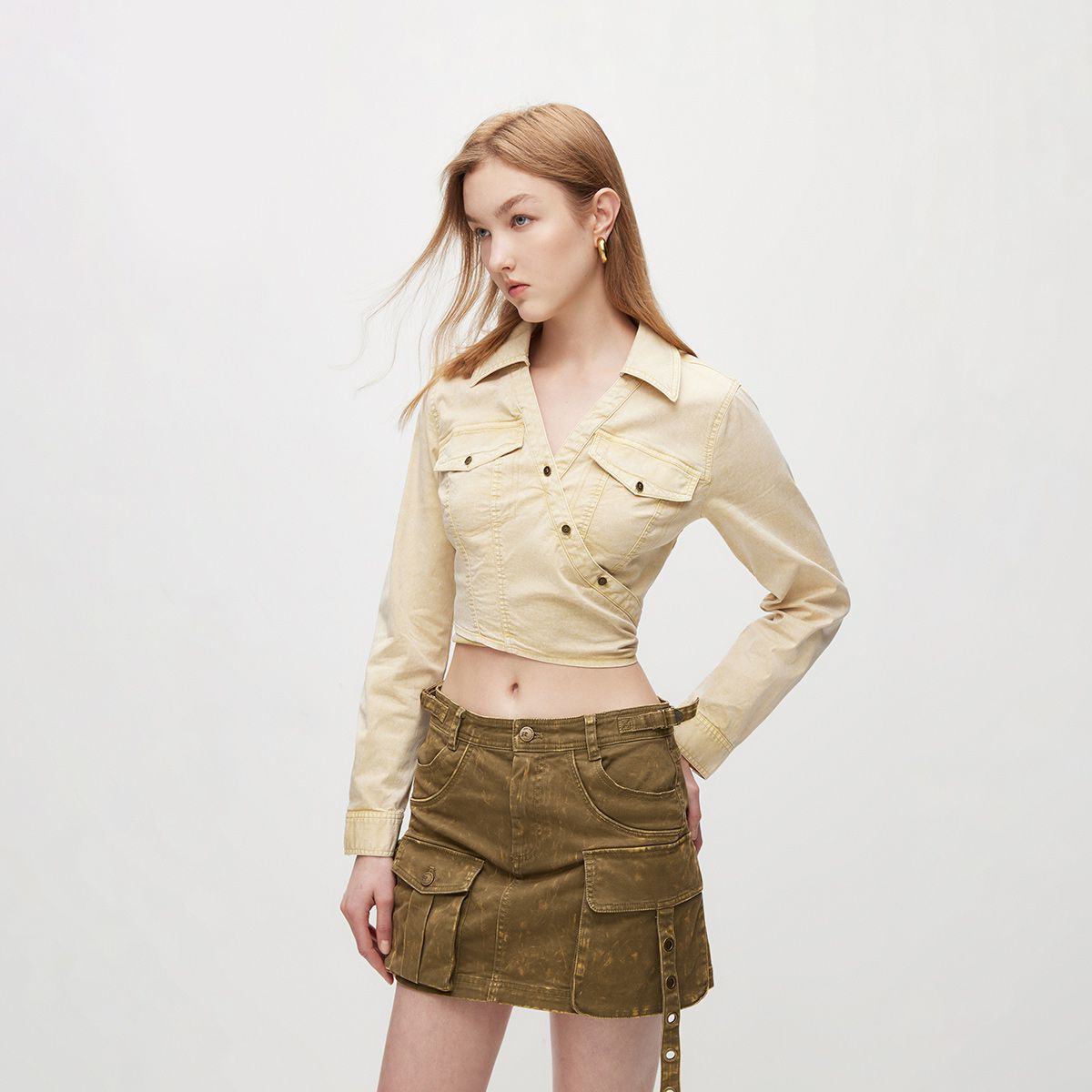 【季潮流复古】夏季做旧交叉领口短款蕾丝衫女 034650